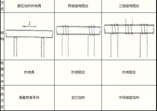 測(cè)量管加熱方式大部分產(chǎn)品采用兩繞組或三繞組線(xiàn)繞電阻;除管外電阻絲繞組加熱方式外還有利用管材本身電阻加熱方式,如表1所示。測(cè)量管形狀有直管形,還有∏字形結(jié)構(gòu),三繞組中一組在中間加熱,兩組分繞兩臂測(cè)量溫度。
