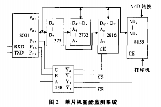 (3)單片機(jī)智能監(jiān)測(cè)系統(tǒng)該部分由8031單片機(jī)、地址鎖存器7415373、EPROM2732、E²PROM2816、并行接口8l55、地址譯碼器74LS138組成,如圖2所示: