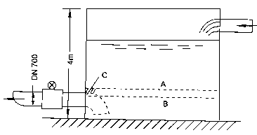 案例4 廣西某水廠在郊區(qū)山頭設(shè)置清水池,利用水池高度勢(shì)能發(fā)送成品水。運(yùn)行人員反映計(jì)量出水量的DN700mm酸堿污水流量計(jì)有時(shí)候流量顯示不穩(wěn)?;蝿?dòng)達(dá)百分之十幾到百分之二十,誤差也大,估計(jì)相差約20%?,F(xiàn)場(chǎng)考查發(fā)現(xiàn)水池如圖7-9所示安裝流量傳感器,水位高度不足就會(huì)卷入氣泡,甚至流量傳感器測(cè)量管內(nèi)不能充滿。如水位降至A線時(shí),雖高出吸入口頂端,但高出不多,還會(huì)在C處產(chǎn)生旋渦,將水位表面空氣卷入形成氣泡,使顯示晃動(dòng);若水位降到B,測(cè)量管將不滿管。我們建議如圖虛線所示裝一彎頭,擴(kuò)大水池有效容量,減少吸入氣泡的機(jī)會(huì),彌補(bǔ)原設(shè)計(jì)的不足。這類(lèi)實(shí)例是經(jīng)常遇到的。