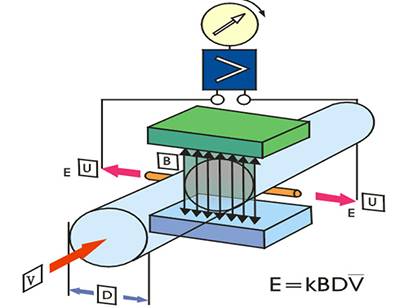 當(dāng)導(dǎo)電液體沿測量管在交變磁場與磁力線成垂直方向運(yùn)動時,導(dǎo)電液體切割磁力線產(chǎn)生感應(yīng)電勢。在與測量管軸線和磁力線相互垂直的管壁上安裝了一對檢測電極,將這個感應(yīng)電勢檢出。